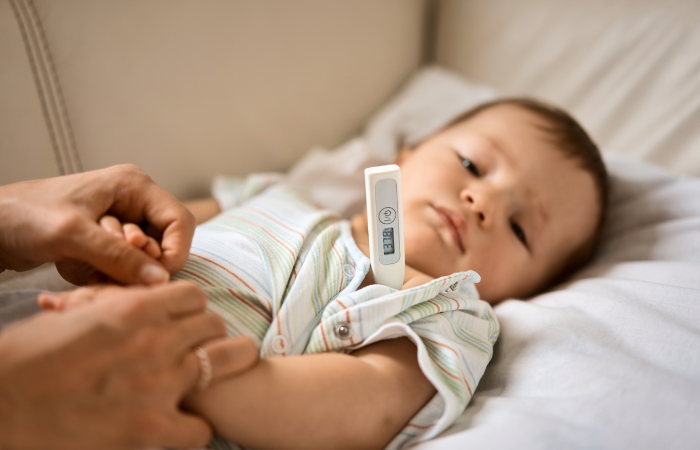 Sốt là dấu hiệu cơ thể bé phản ứng với nhiễm trùng, mọc răng, tiêm phòng hoặc thay đổi thời tiết. Khi bé bị sốt, mẹ cần đo nhiệt độ thường xuyên, nếu nhiệt độ trên 38,5°C, nên cho bé uống thuốc hạ sốt theo hướng dẫn. Lau mát cho bé bằng nước ấm, cho bé mặc quần áo thoáng và bú nhiều hơn để tránh mất nước. Nếu bé sốt cao liên tục, co giật, quấy khóc hoặc lừ đừ, mẹ nên đưa bé đến cơ sở y tế để được thăm khám và điều trị kịp thời.